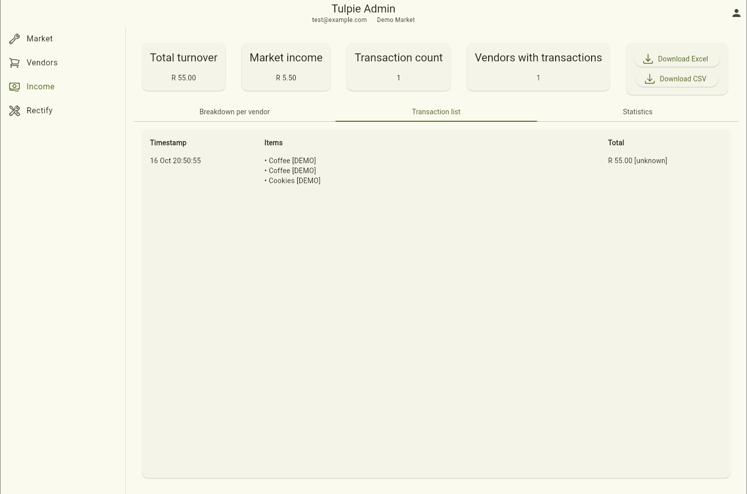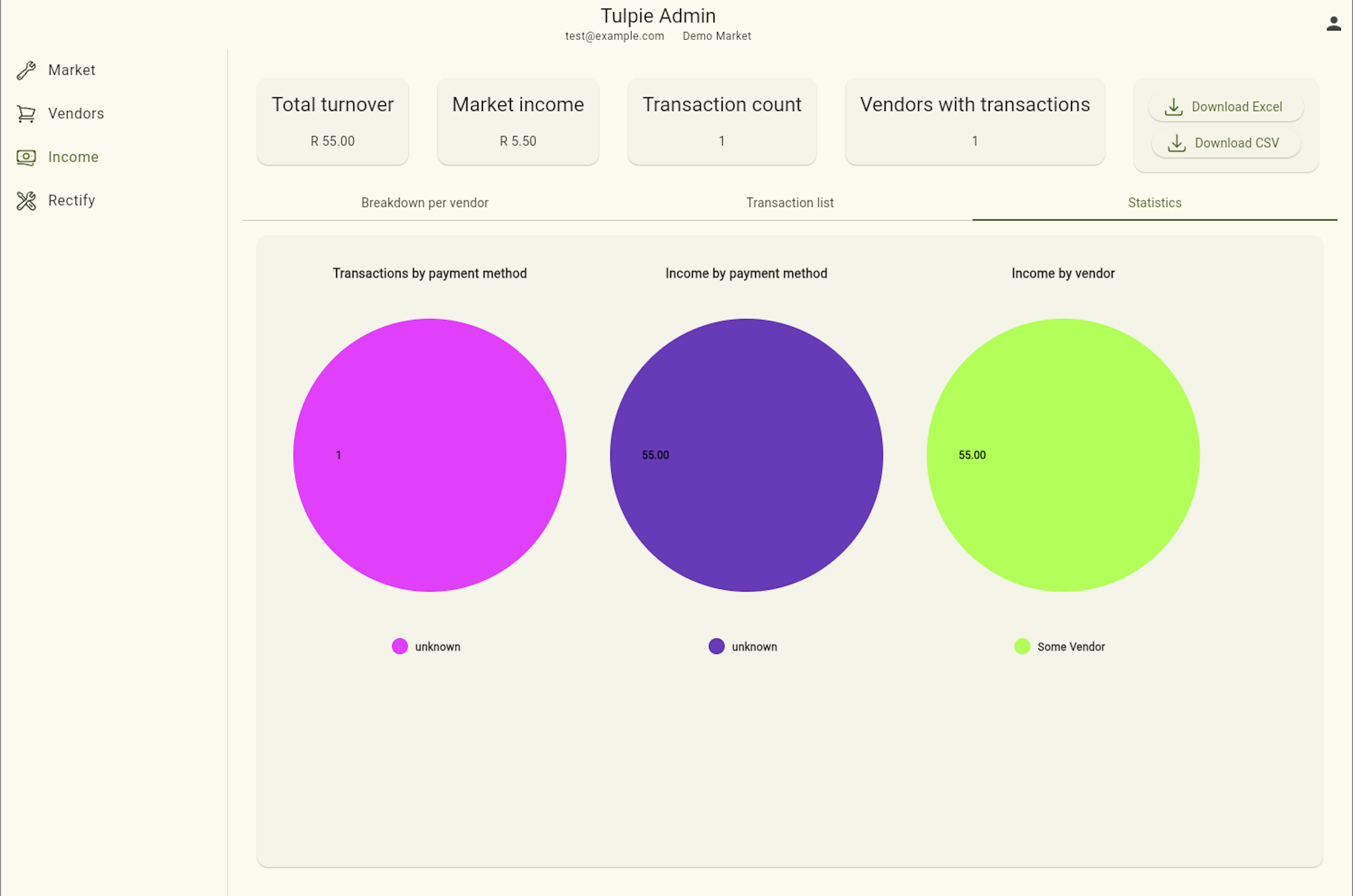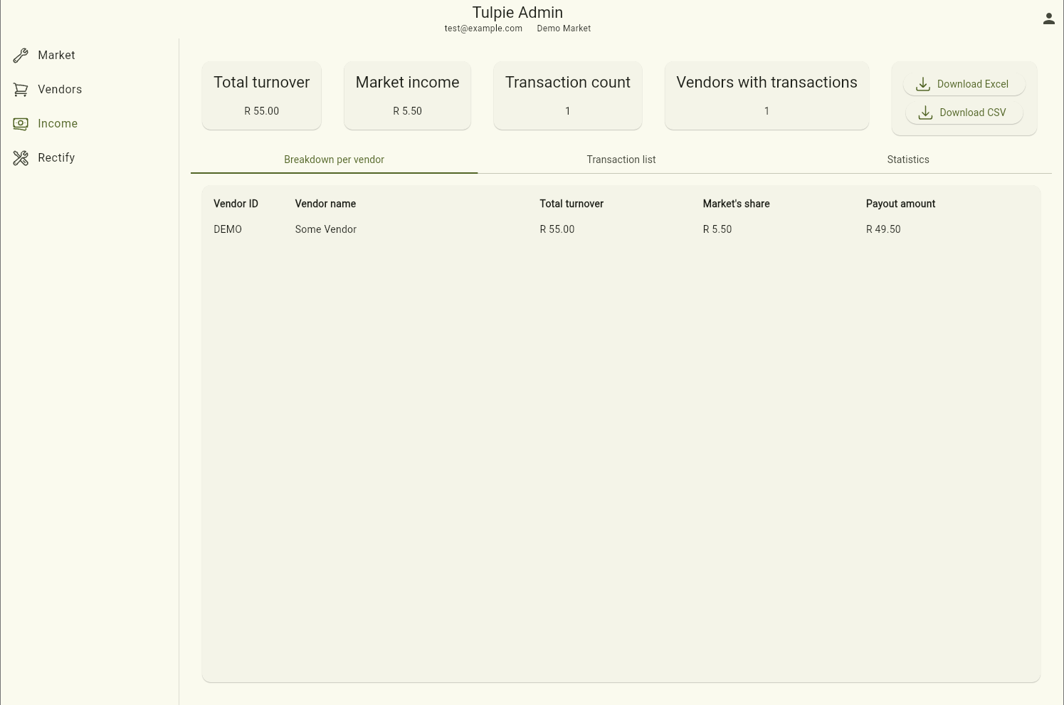 - Quickly see your and all your vendors' total turnover and total income as well as what you owe everyone