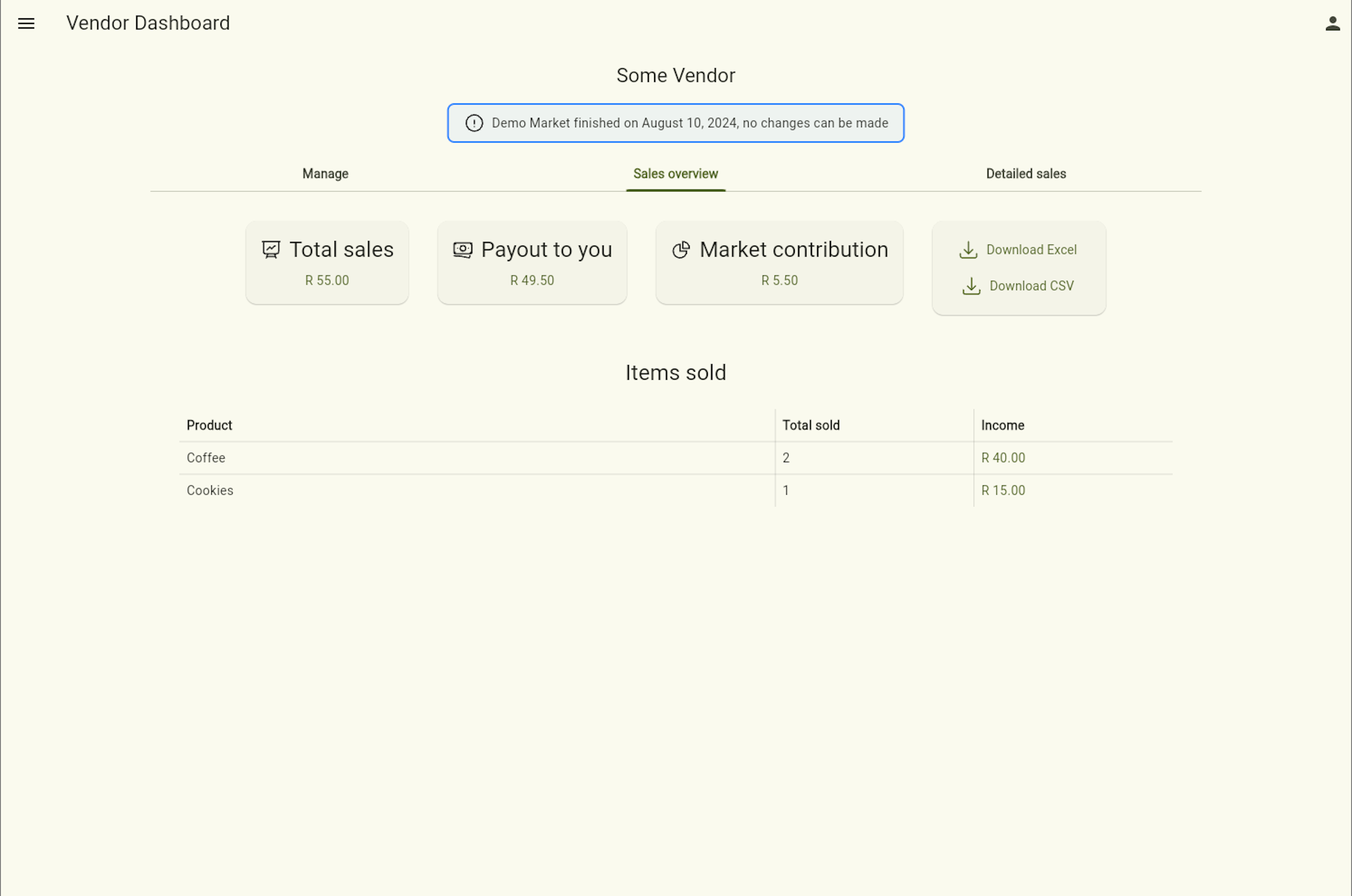 - Let the vendors download the QR code labels they will need to sell at your market.